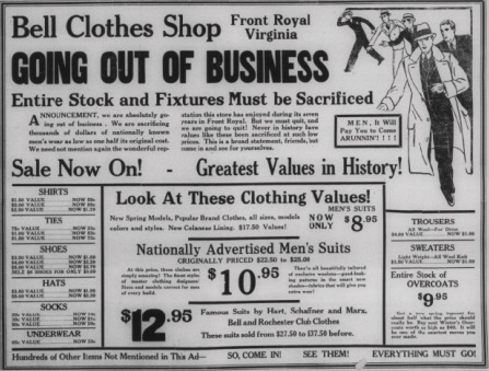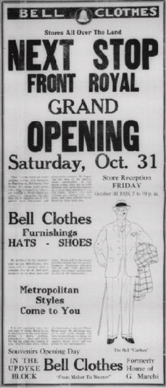 THE SECRET IS OUT! Bell Clothes Shop is CELEBRATING 100 years in the Shenandoah Valley! Prior to moving his Bell Clothes Shop operation to Winchester in 1931, Samuel Gilbert Shendow opened his first store in Front Royal, VA, on October 31, 1925.