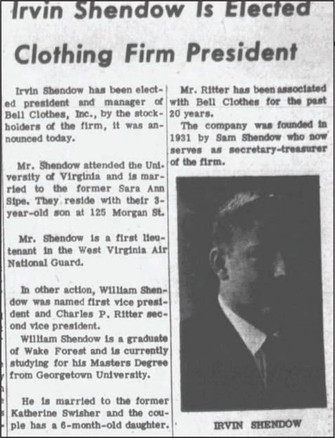 Samuel Gilbert Shendow, who left Greensburg, Pennsylvania after graduating from high school, made his way to Washington, D.C., by 1919 – following stops in Boston, New York, Philadelphia, and Richmond. Soon after his arrival in the Capital, he was hired by The Bell Clothes Shop and its ever-expanding franchise, which at the time boasted two stores in Washington, D.C., two in New York City; and one each in Baltimore, Norfolk, Chattanooga, and Pittsburgh.